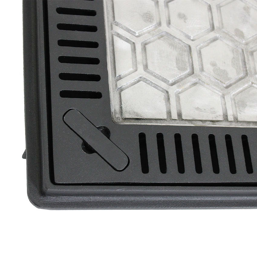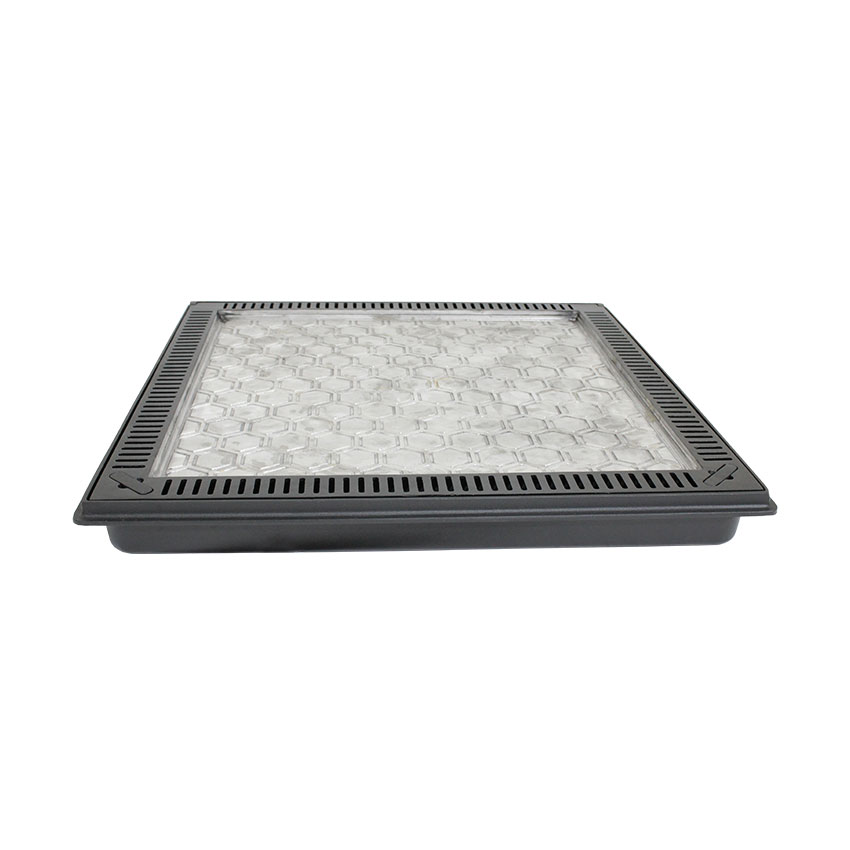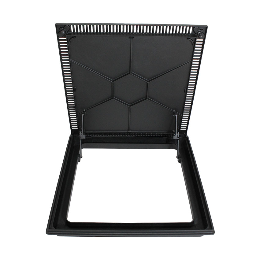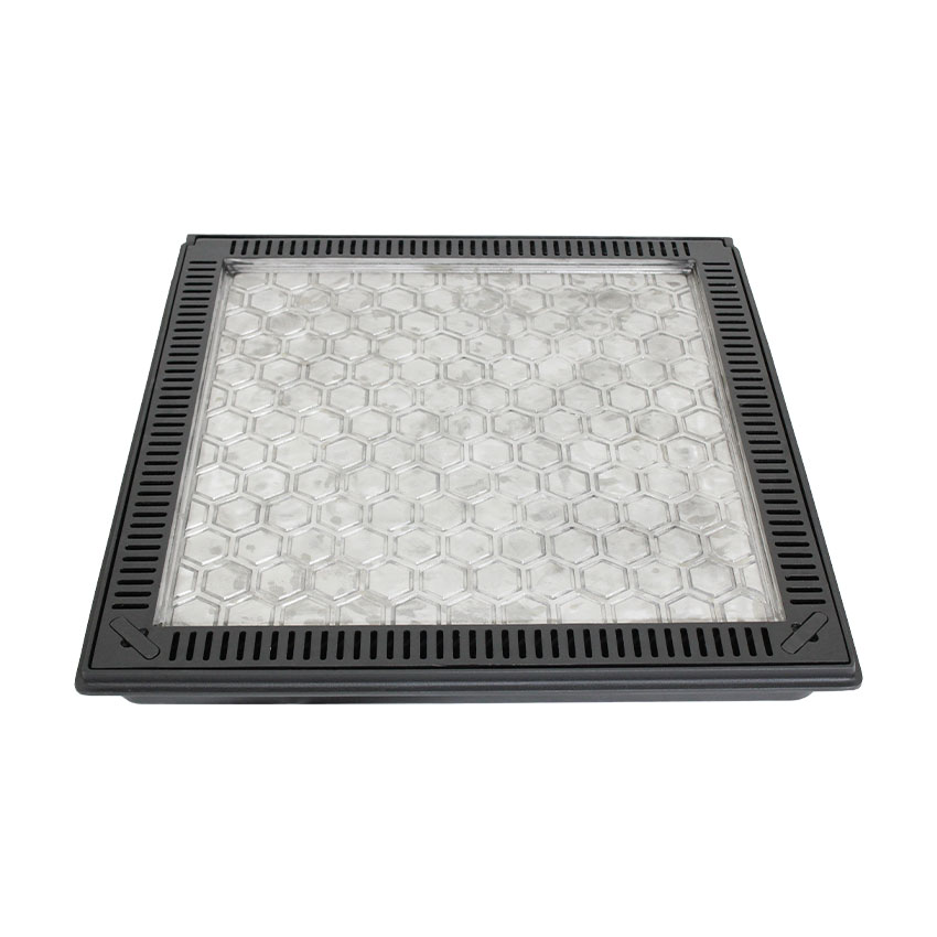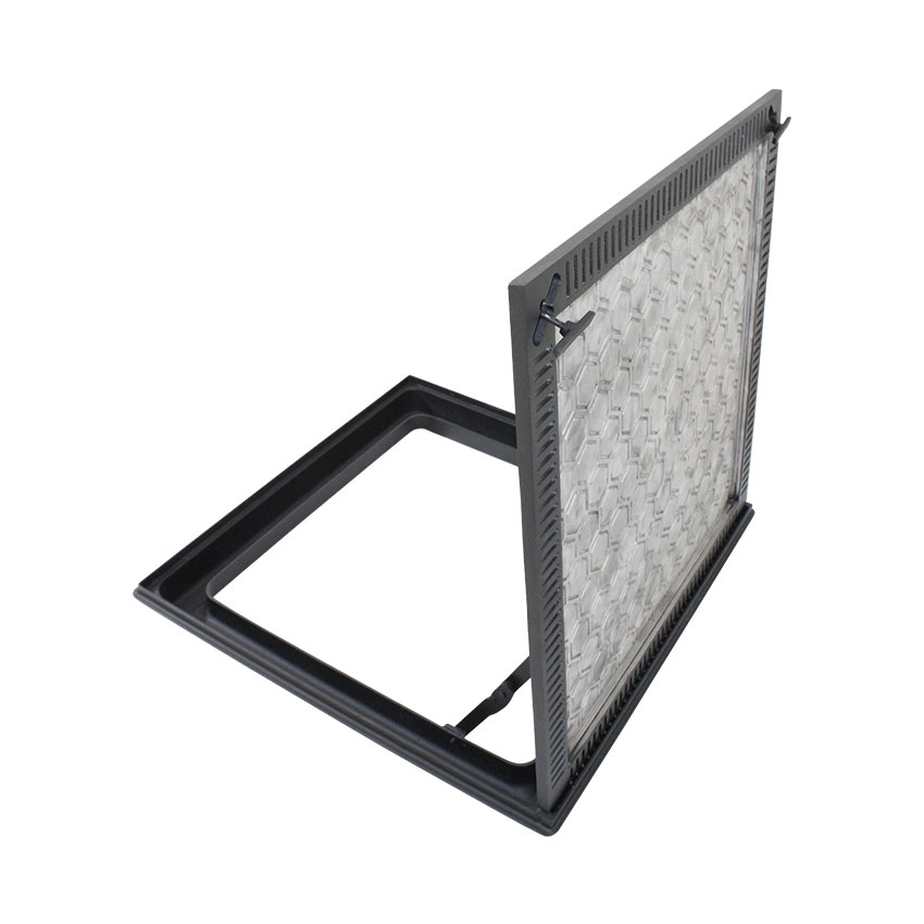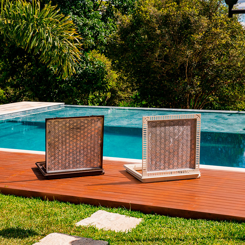 Tampa casa de máquina design Colmeia com rebaixo para assentamento de cerâmicas, grelha aparente, puxadores articulados embutidos. Sistema de abertura com travas duplas de segurança. Produzida em alumínio fundido com pintura eletrostática, ideal para aplicações em ambientes externos. Suporta até 500kg de passagem. Proteção para casa de máquinas.