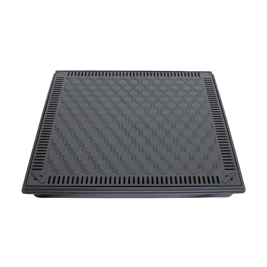 Tampa casa de máquina design Colmeia sem rebaixo, grelha aparente, puxadores articulados embutidos. Sistema de abertura com travas duplas de segurança. Produzida em alumínio fundido com pintura eletrostática, ideal para aplicações em ambientes externos. Suporta até 500kg de passagem. Proteção para casa de máquinas.